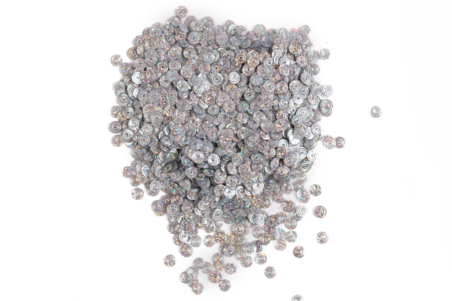 Sparkling Silver Color Round Shape Plastic Sequins – Lightweight and vibrant sitara/sippi ideal for embellishing suits, dresses, sarees, and various craft and decoration projects. Comes in a 50-gram pack.