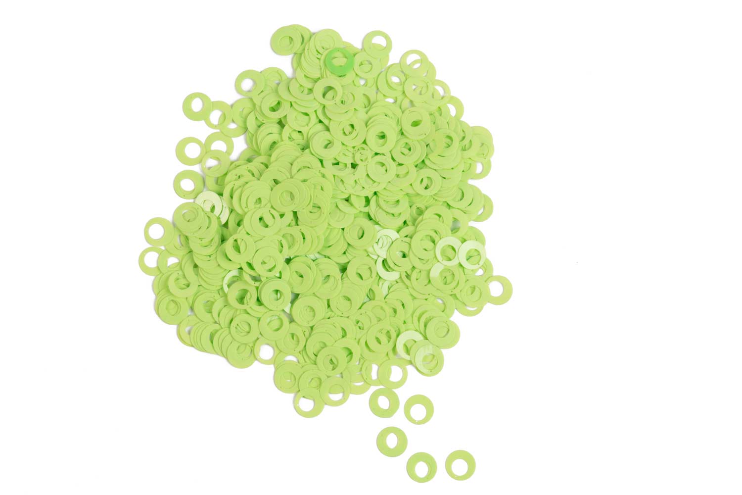 Light Green Color Round Shape Plastic Sequins – Lightweight and vibrant sitara/sippi ideal for embellishing suits, dresses, sarees, and various craft and decoration projects. Comes in a 50-gram pack.